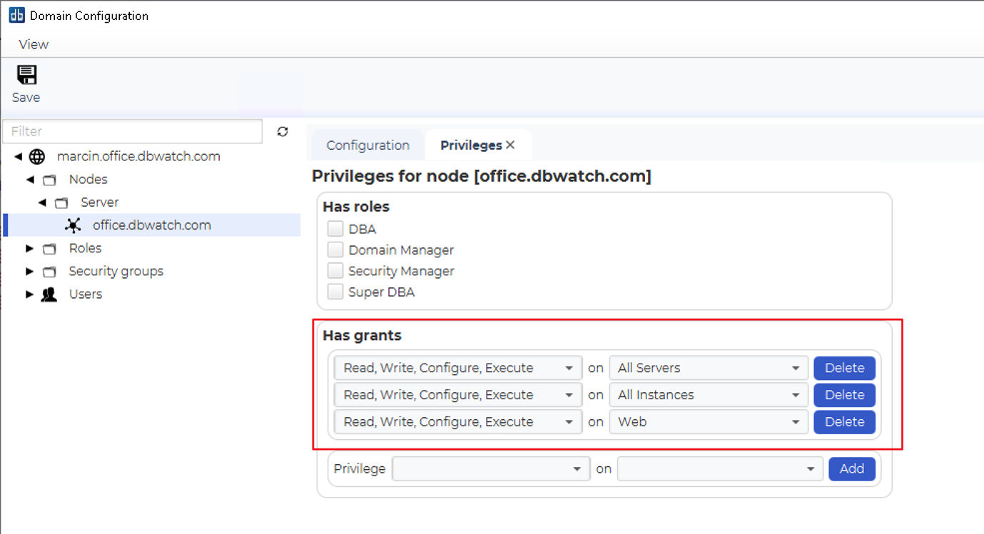 Go to the Privileges tab for your dbWatch server (for example, office.dbwatch.com).