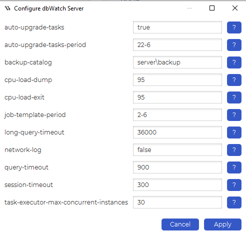 | auto-upgrade-tasks-period | Specifies period when the dbWatch Server should automatically upgrade tasks. Format is [from hour]-[to hour], f.ex ‘22-6′ will be from 22 in the evening to 6 in the morning. |