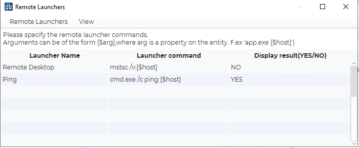 This brings up the Configuration Dialog. By default, two launchers are defined. Remote Desktop and Ping