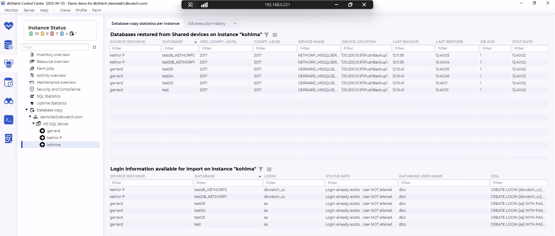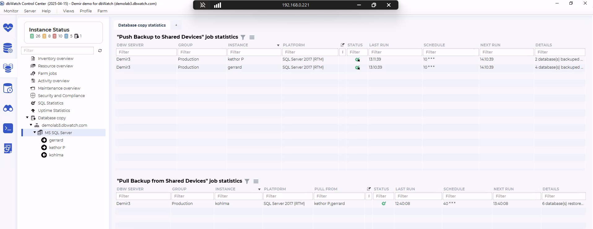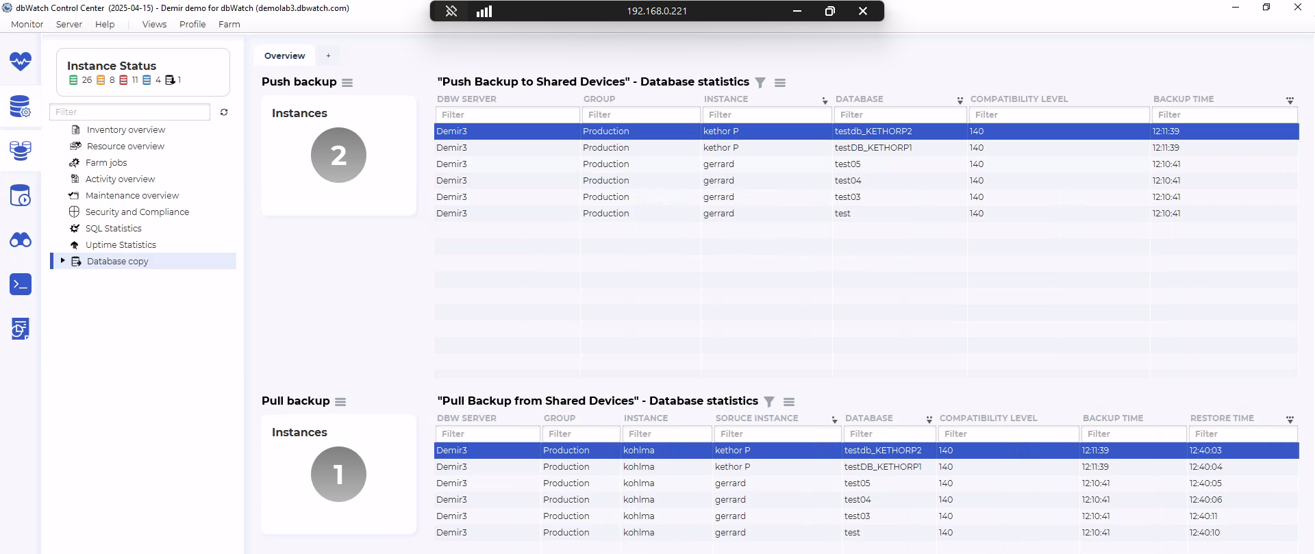 dbWatch Control Center provides a powerful overview of all database copy operations—both Push Backup to Shared Devices and Pull Backup from Shared Devices—through the Farm View interface.