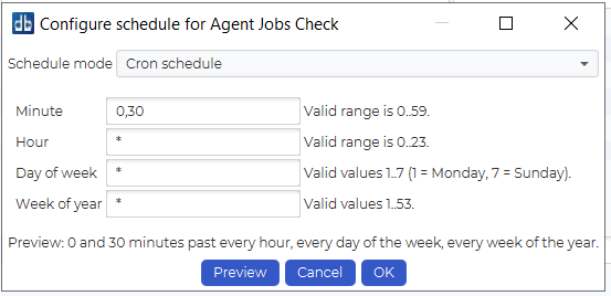 The cron schedule is loosely based on the crontab format used on Unix systems. We have 4 fields that can be set, “Minute”, “Hour”, “Day of week”, and “Week of year”.