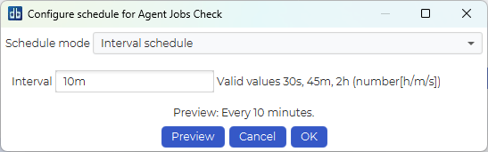 The interval schedule can schedule a job at repeating, but not exact times. Values are a number with a time denominator, such as 30m (every 30 minutes) or 3h (every 3 hours).