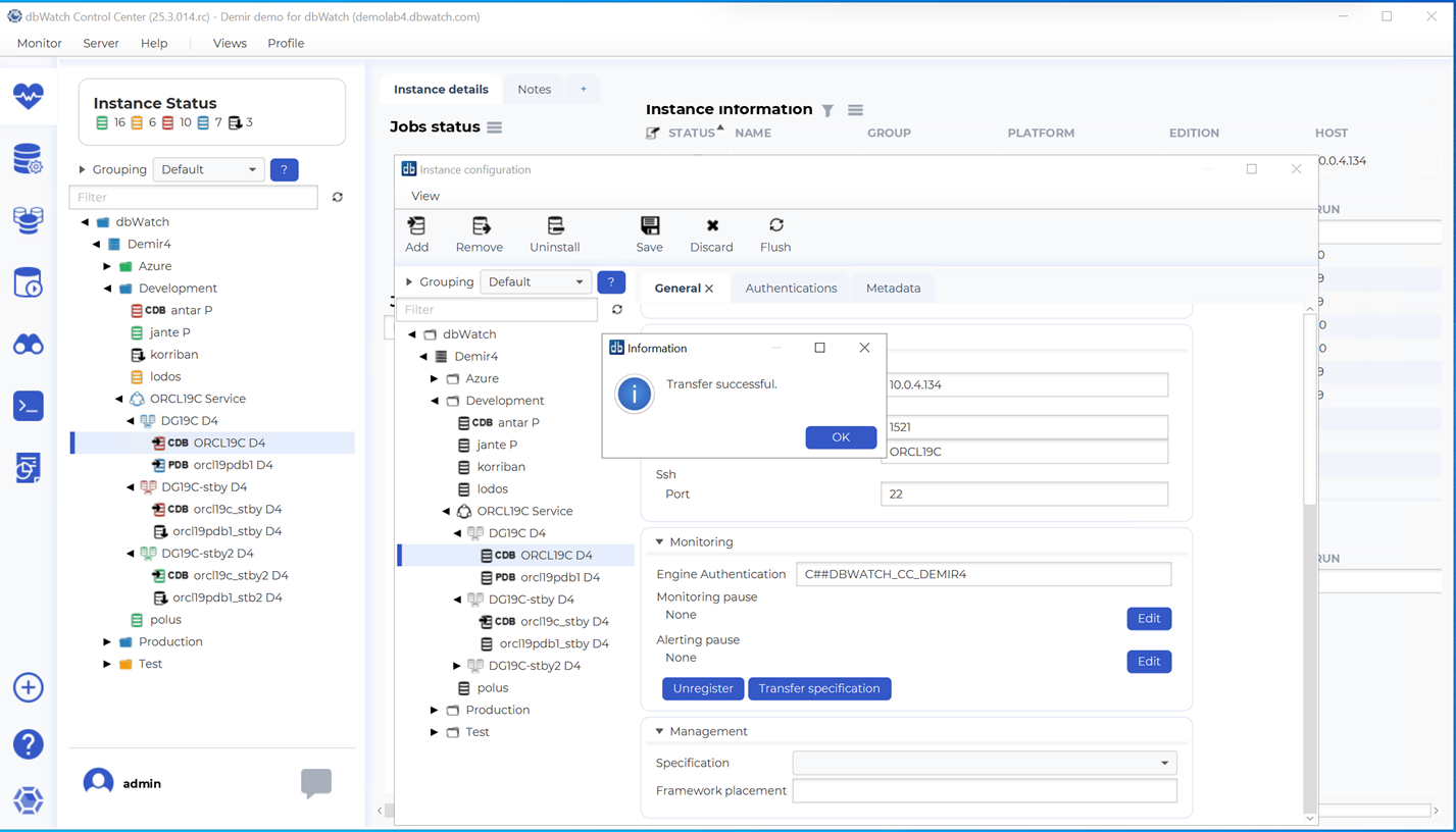| orcl19c_stby D4 (new primary) | Run Transfer Specification, becomes monitoring target |