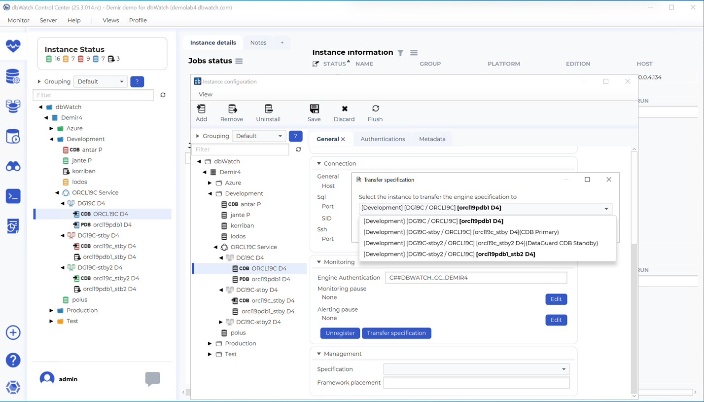 The Transfer Specification function is used to transfer connection- and monitor-related properties from one instance to another. This is especially relevant in Oracle Data Guard environments, where the primary database role may shift between different instances during a switchover or failover.