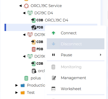 - The PDB instances follow the same transition, with correct Connect / Disconnect settings.