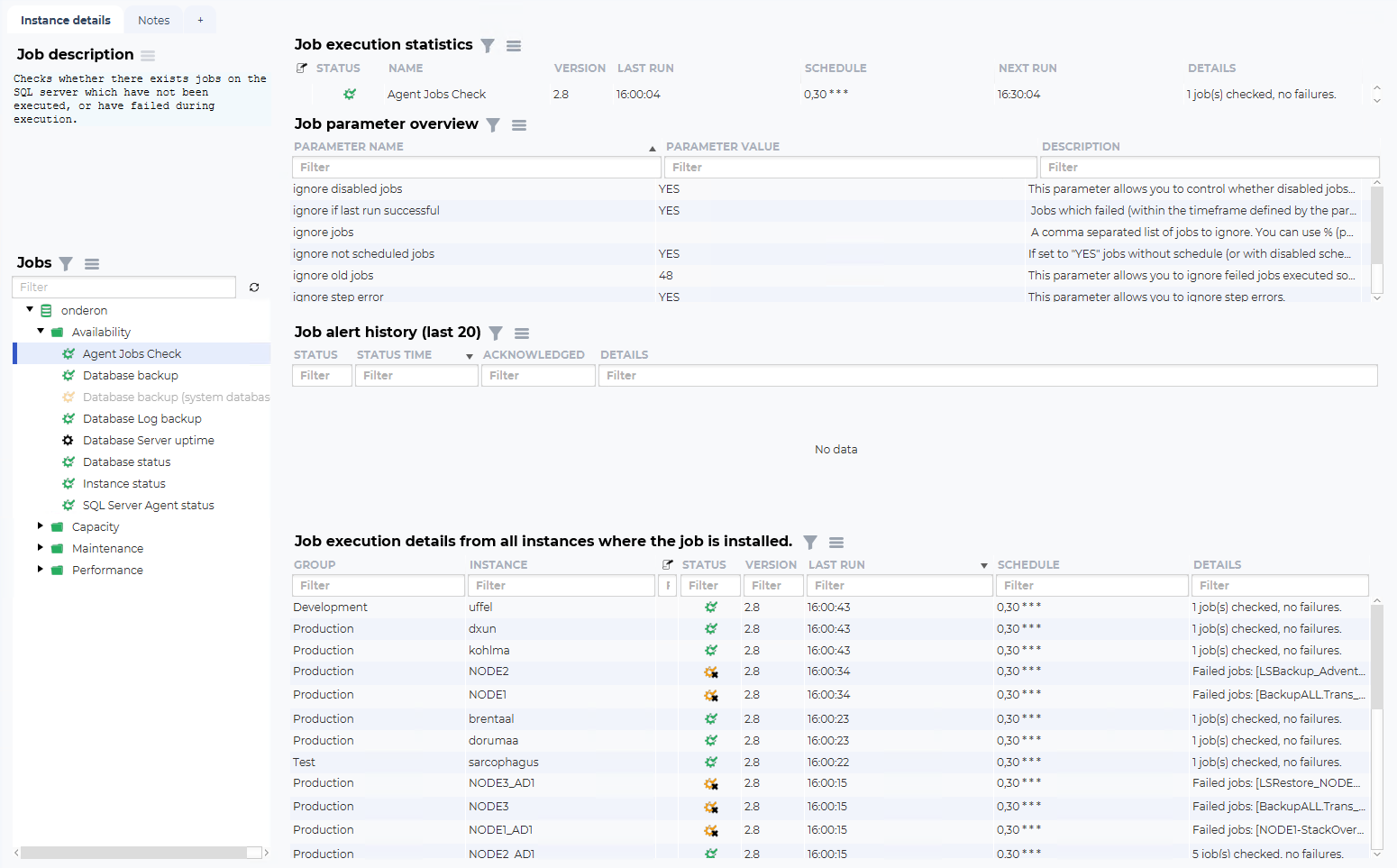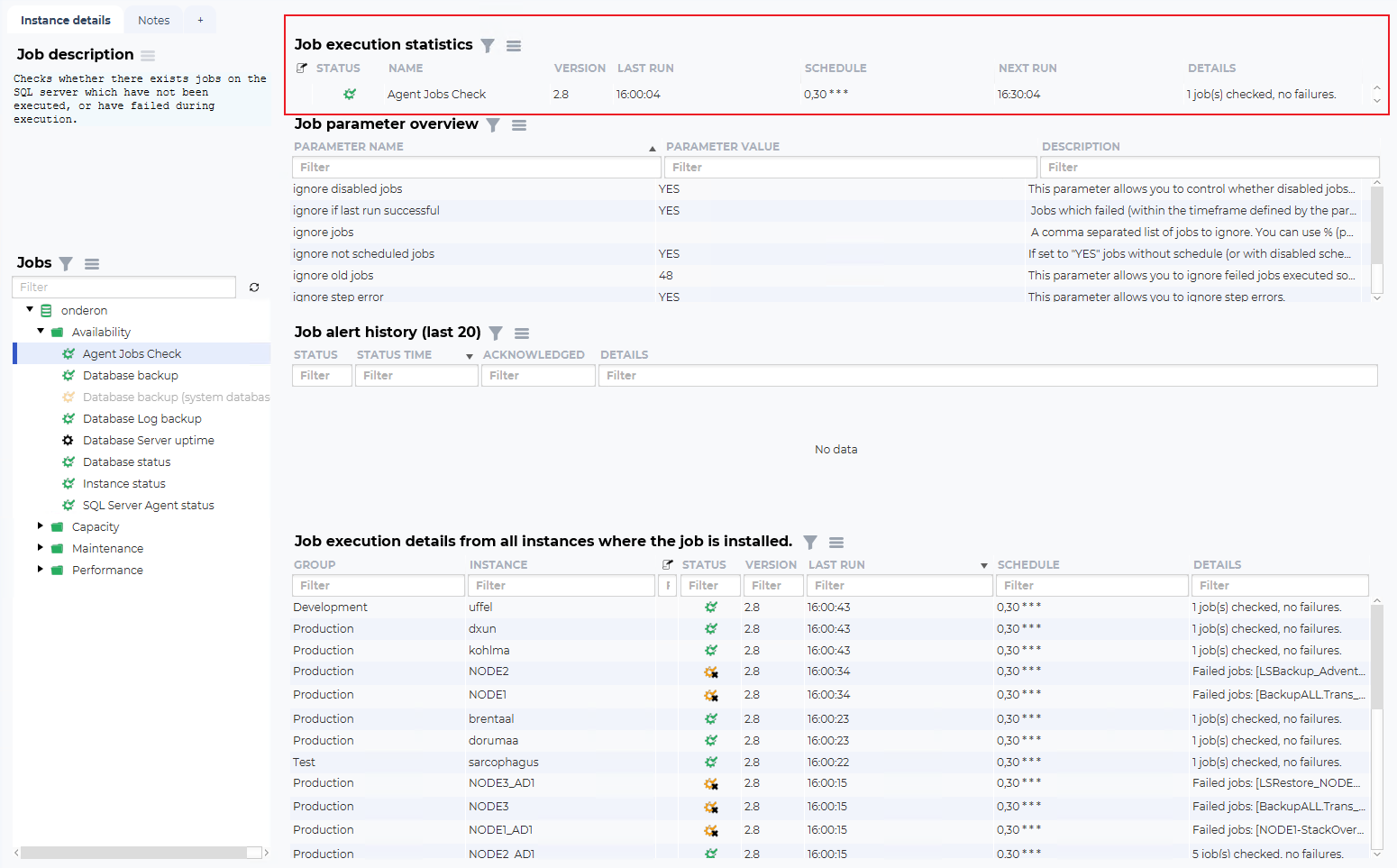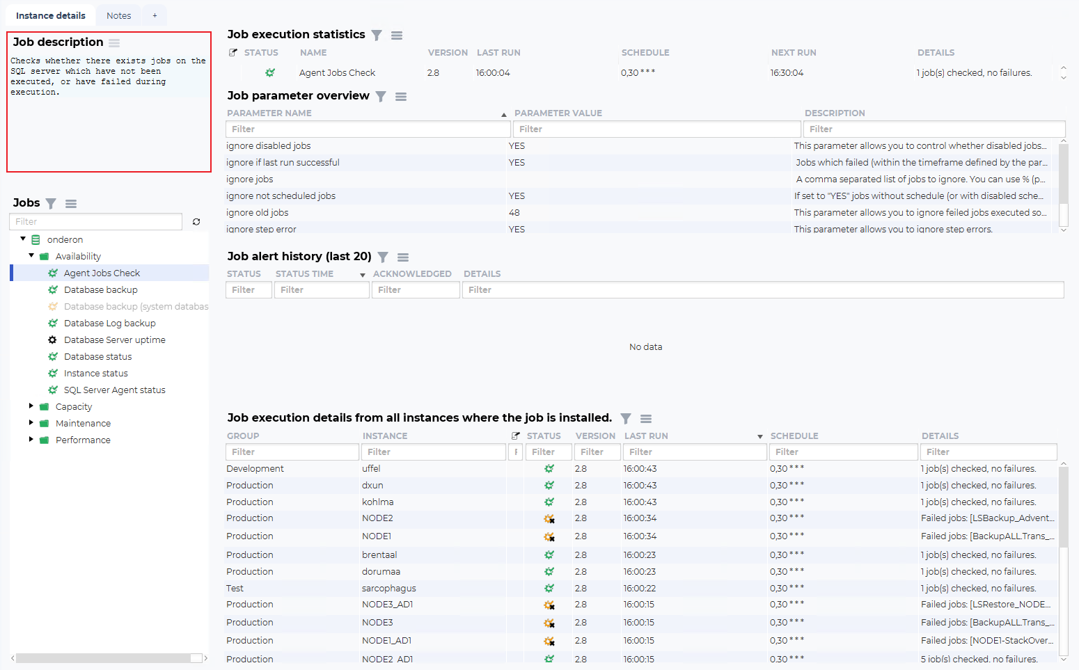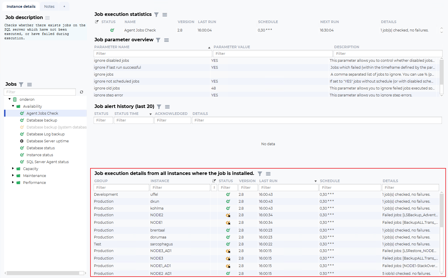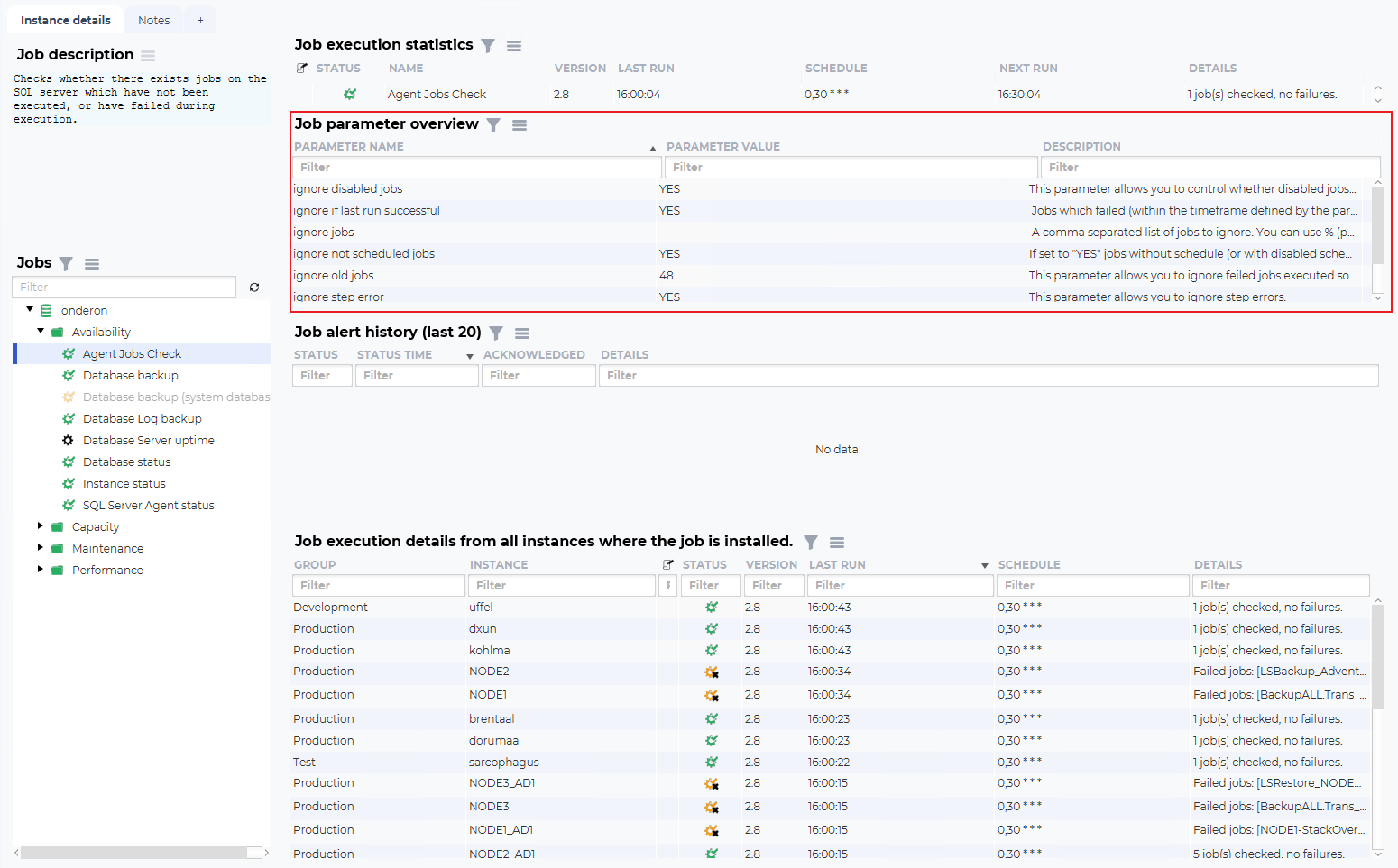 The idea of this overview is to show current and historical state, configured parameters and how the job is behaving on other database instances.