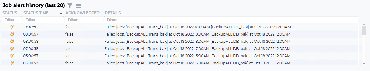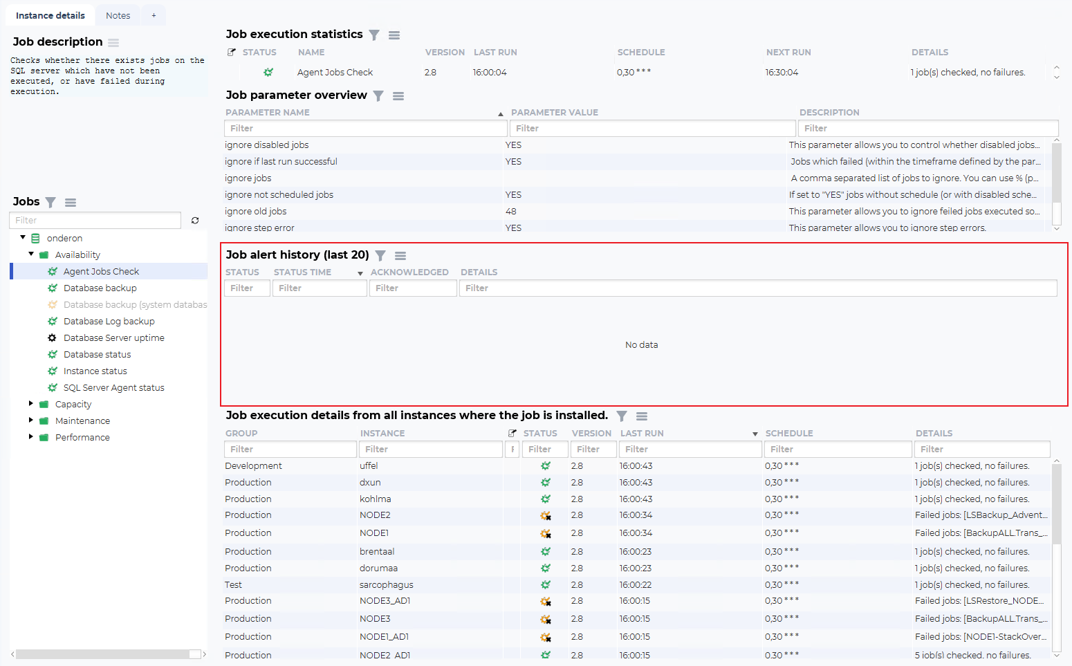 The job alert history (last 20) shows the historical errors this job has had on this instance. It can be empty, as in this example, and show up with “No data”