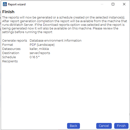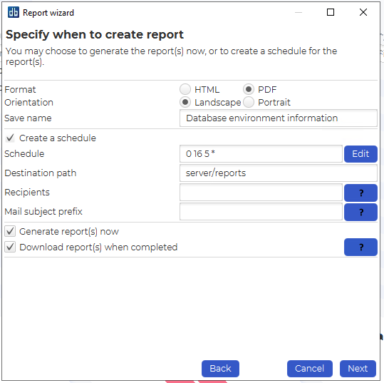 A scheduled report will be generated at the specified intervals by the dbWatch Server and placed in the catalog specified under “Destination path”.You can specify a set of email addresses under “Recipients” (comma seperated list) and the report will be sent to them each time a report is generated.