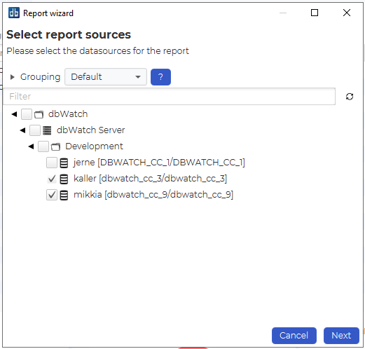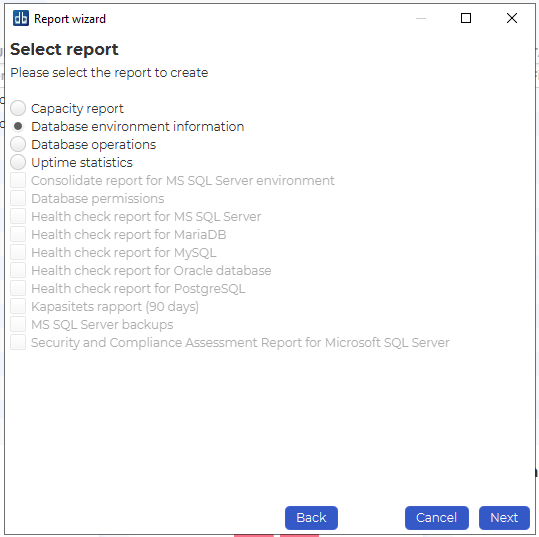 In the first step you will be asked to select the database instance you wish to generate a report for. The instance that does not have a user/login set for generating the report content, will be shown greyed out with a “No authentication” tag. To set a user/login, simply click on the instance and a dialog will appear.