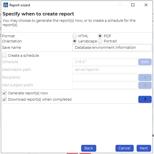 Next you can specify the format the report should be generated in (PDF or HTML), for PDF you can also specify Landscape or Portrait mode.