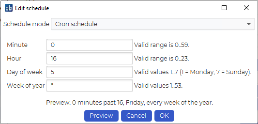 You can define the schedule by clicking on “Edit” next to the scheduled field, you will then see the standard dbWatch schedule editor.